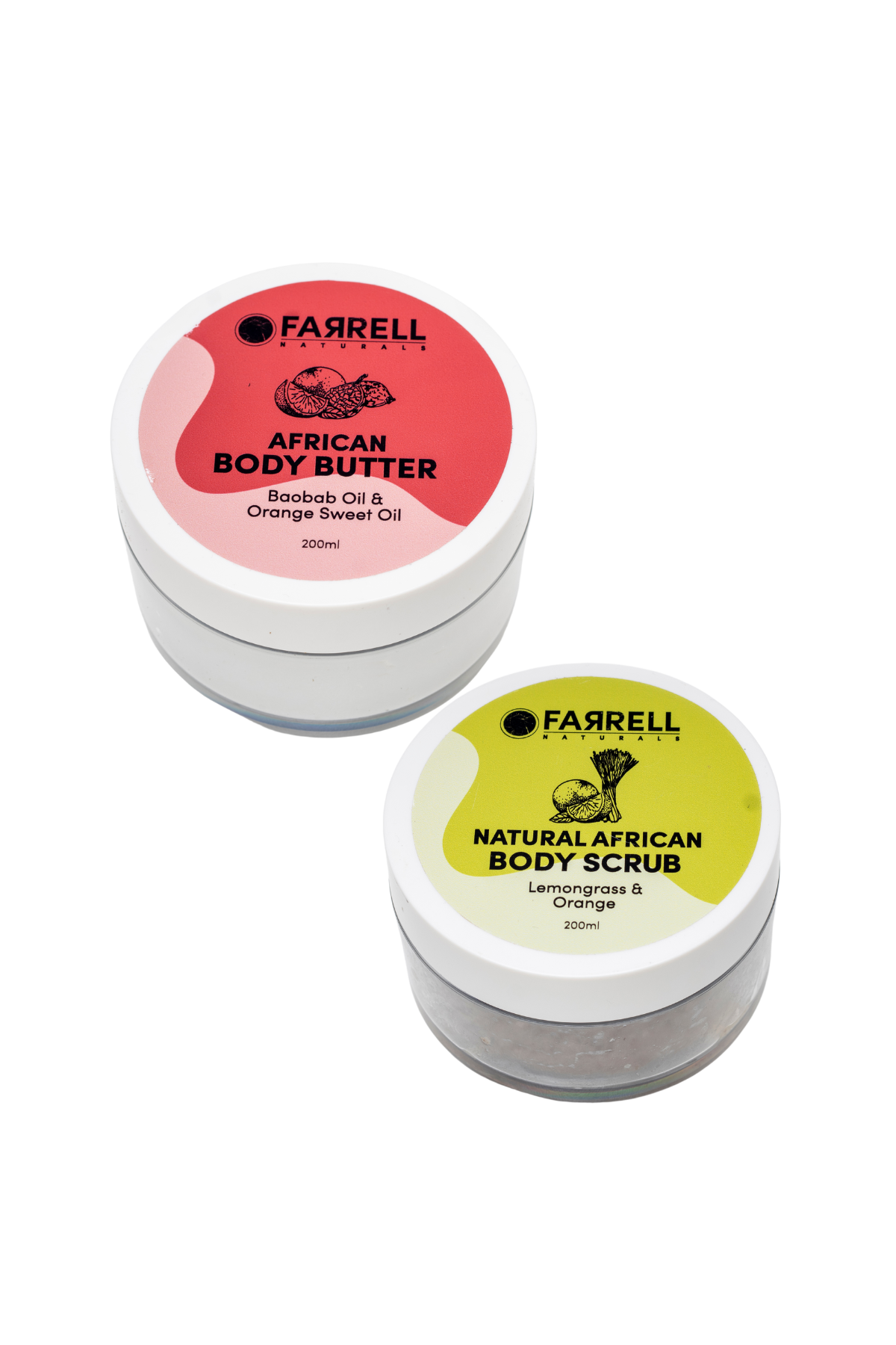 Pamper your skin with our luxurious Body Butter & Body Scrub Collection, featuring the nourishing Baobab Oil & Orange Sweet Oil Body Butter and the invigorating Lemongrass & Orange Body Scrub. This dynamic duo combines the best of exfoliation and hydration, leaving your skin feeling silky smooth, deeply moisturized, and radiantly refreshed. Infused with natural ingredients, these products work together to enhance your skin's natural glow, making every skincare routine a spa-like experience.