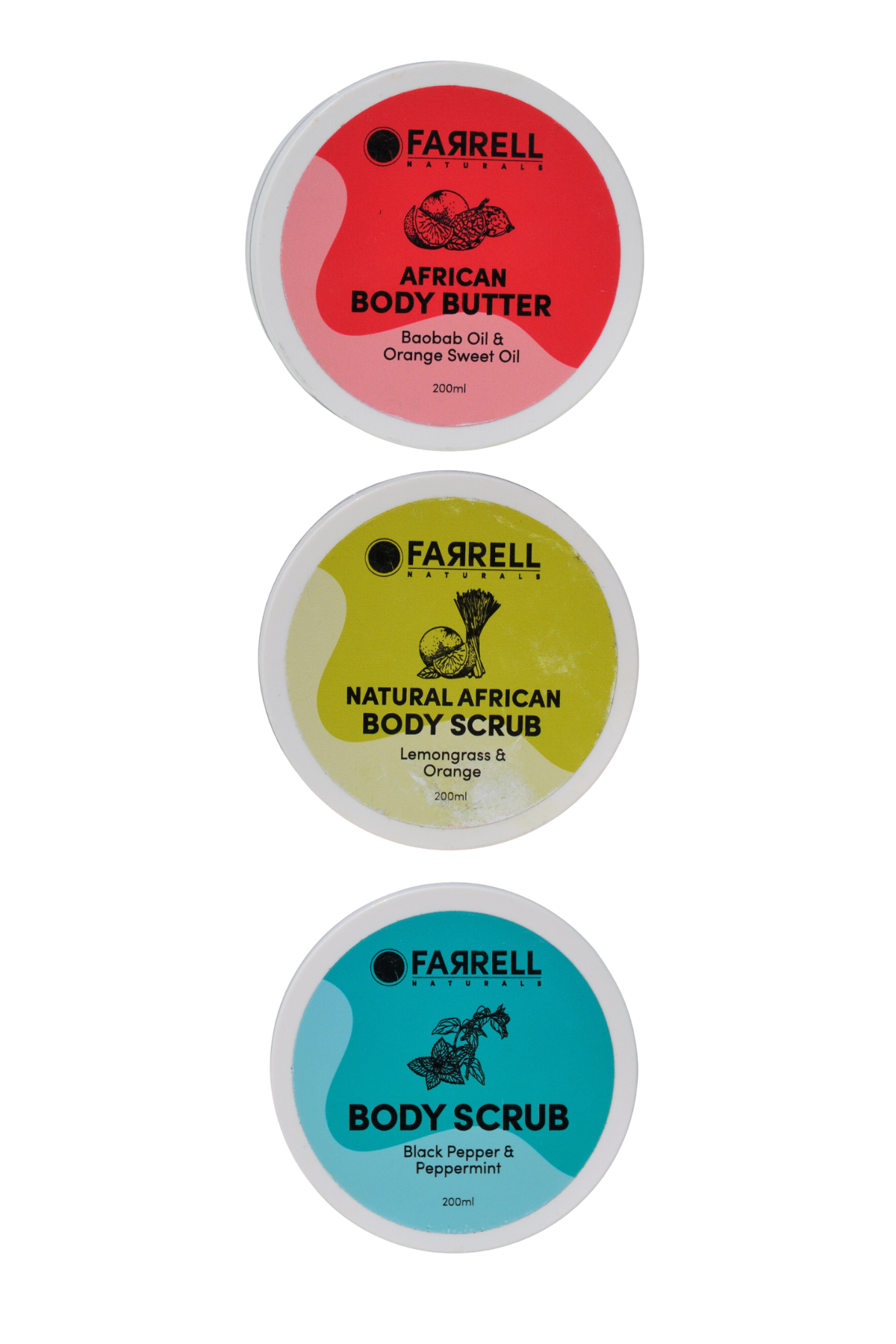 African Body Scrub: Fine Salt, glycerin, Butyrospermum Parkii (Shea) Butter, cocos nucifera (coconut) oil, Vitis Vinifera (Grape) Seed Oil, Adansonia Digitata (Baobab) fibre, Cymbopogon Flexousus (lemongrass)leaf oil, Vitamin E, Citrus Aurantium Dulcis (Orange) Peel Oil.